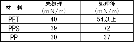 「コロナ処理によって、何故、表面張力が高まるのですか?」に記述していますが、基材の種類によって表面張力は変わります。