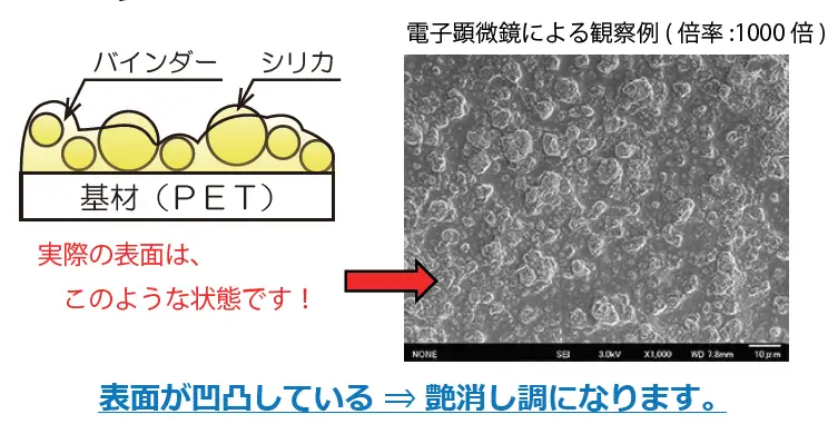 コーティングマットとは、プラスチックフィルムの表面にシリカなどのフィラーを含有させたバインダー(合成樹脂)をコーティングすることにより、微細な凹凸やマット層を形成し、反射を抑えた艶消し外観や触感の向上、ブロッキング防止、視認性改善などを実現する表面加工技術です。