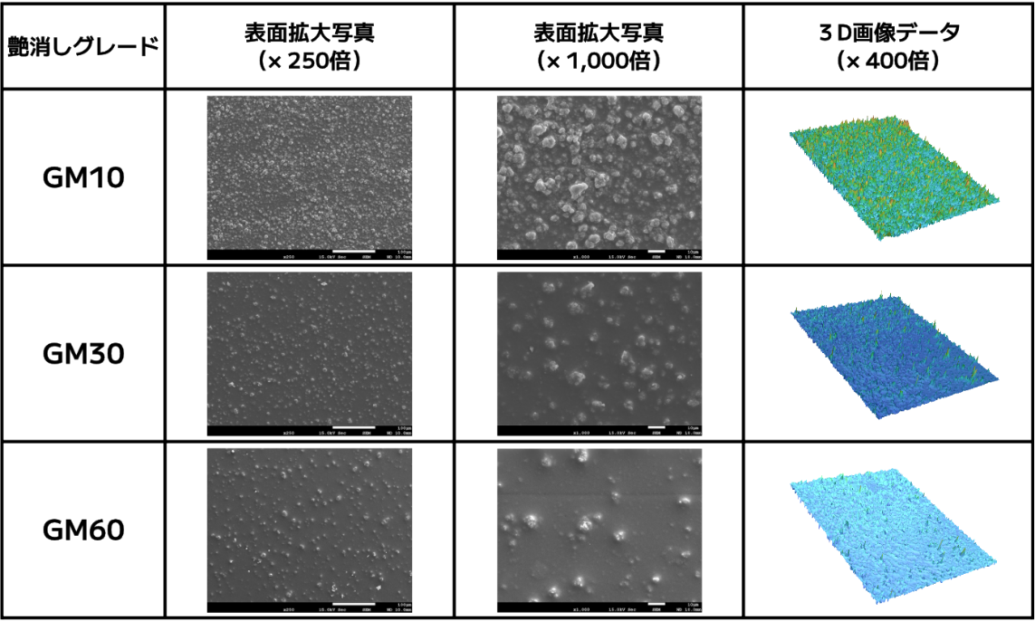 ・光が乱反射することでグロス値(光沢度)が低下し、艶消し調の外観になる