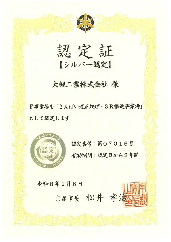 2026/02/24 京都市環境政策局による令和7年度のさんぱいチェック制度に於いて「さんぱい適正処理・3R推進事業場」として2度目のシルバー認定(2年間有効)を受け、認定証を受領致しました。 認定事業場 | 京さんぱいポータル (kyoto.lg.jp)